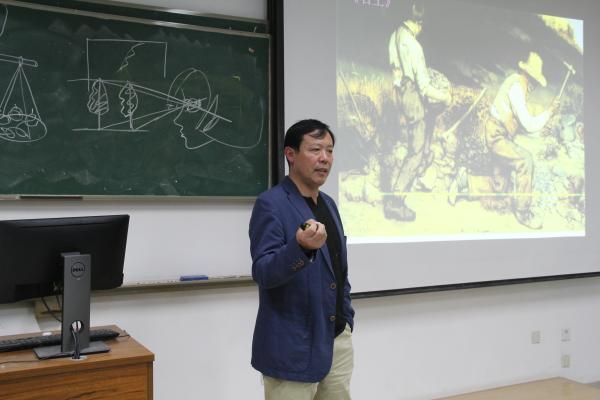 讲座中,王志刚老师为同学们介绍了美术作品以及欣赏概述、美术作品的形式与内容、欣赏方法等内容。从美术的起源到发展过程中的形式的变化,从美术作品的具体内容到内容表现的内涵,美术作品具体的画面安排技巧到东西方美术作品迥然不同的艺术性格,远古的旧石器时代的生产工具到现代美术作品,他精心地讲解每一幅挑选的画作与每一个理论知识点,将艺术欣赏的理论与实践有机的结合在了一起。他用诙谐幽默的语言将晦涩难懂的美术欣赏理论变得通俗易懂,一次次引起同学们热烈的掌声。