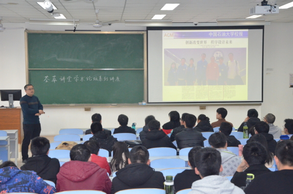 张学辉老师从ACM赛事的现状、如何准备ACM比赛以及ACM竞赛对学生个人成长等方面讲述了如何通过参加程序设计竞赛提升创新能力。他认为当前国家已将编程纳入了创新人才培养体系,各高校也愈加重视ACM赛事,社会各大IT公司对编程人才也是求贤若渴,对进入大学校门时间不长的大一学生来说,参加ACM赛事是培养和提升软件编程与创新能力最好的途径。接着,张老师以带领的学生参加ACM赛事的经历进行现身说法,从开始的艰难起步到最后的硕果累累,一路成长、一路收获,他用自身经历向同学们展示了编程和ACM赛事的强大魅力,极大地激发了同学们探索的热情。在Q&A环节,同学们争相提问。有同学问到“非计算机专业的同学可以参加ACM赛事吗?参加ACM赛事有什么要求?”张教授以其带领的团队为例做了详细的解答,并告诉大家,参加ACM赛事需要大量的训练,以及一定要培养自己勇于经受挫折的坚毅品性等。
