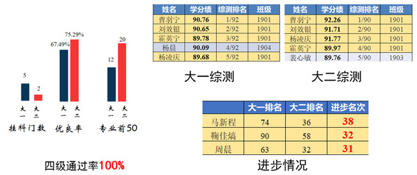 在这样的制度下,四级通过率100%,从大一学年的挂科门数5,优良率67.49%,专业前五十12名,到大二学年的挂科门数2,优良率75.29%,专业前五十20名,三名同学取得较大进步。
